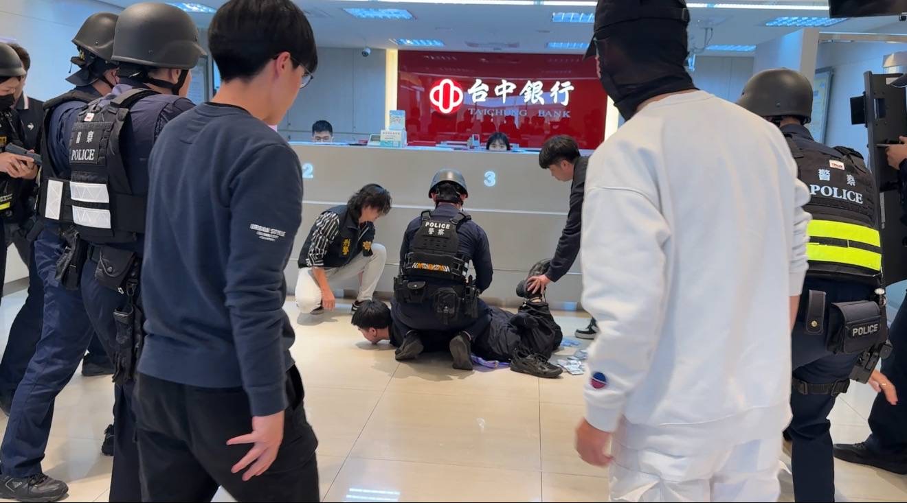 歹徒自認遭識破後情緒失控,突然亮槍威脅行員交付現金並要求現場民眾趴下。行員沉著依防搶程序處置,暗中啟動警報系統,同時假意配合安撫歹徒情緒,並巧妙製造「鈔票散落」情境,成功分散歹徒注意力,爭取警方進場時機。