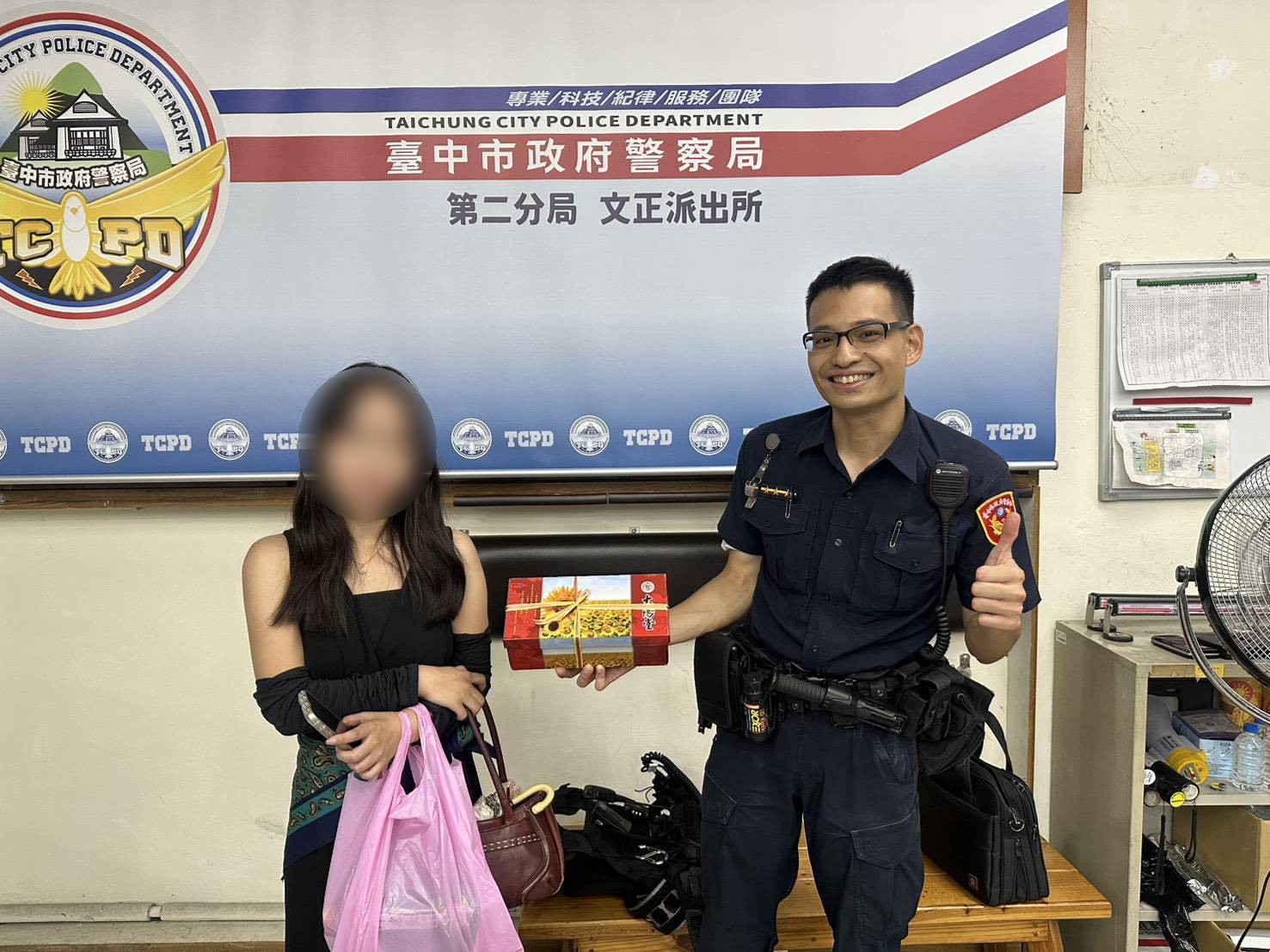 不久後,鄰近大誠派出所果然來電,表示有一名日本籍女子神情焦急前來報案,稱自己的錢包遺失。經確認,該21歲女子瀧澤女士即為錢包失主,隨即協助聯繫並將其載至文正派出所,瀧澤女士確認物品無誤後,難掩激動之情,表示來臺旅遊期間於中華路夜市購物時不慎遺失錢包,因錢包內有重要證件,原本焦急萬分,未料員警高效率協助尋回,令她對臺灣警察的專業與熱心印象深刻,並特地贈送臺中在地名產太陽餅以表謝意。