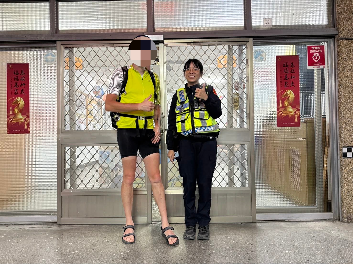 馬克一路南下體驗臺灣自然風景與人文風情,當晚見天色轉暗、行程受限,遠遠看見關山警察分局鹿野分駐所外醒目的「POLICE」袖招字樣,隨即前往請求協助。他以英文向值班警員黃瓊慧說明需求,黃員即以流利英文親切回應,耐心了解其行程與露營需求,過程中溝通順暢、毫無隔閡。隨後,警員李明憲亦主動加入協助,考量夜間安全、地點便利性及旅客實際需要,積極為其尋找合適的露營場地。經所長陳泰山多方聯繫與協調,最終獲得當地宮廟支持,提供廣場旁一處空地讓馬克紮營,且地點緊鄰超商,生活機能完善,對長途騎行的旅人相當便利。之後馬克開心地與警員合影,並向員警講述這幾天的精彩旅程,盛讚臺灣真的好美。營地順利安頓後,馬克難掩喜悅,頻頻向協助的員警表達感謝。晚間他前往超商用餐時,巧遇巡簽勤務的陳所長,雙方熱情寒暄,馬克再次致謝,直言此次經驗讓他感受到臺灣警察的專業與人情味,也為環島旅程增添一段難忘而溫暖的回憶。