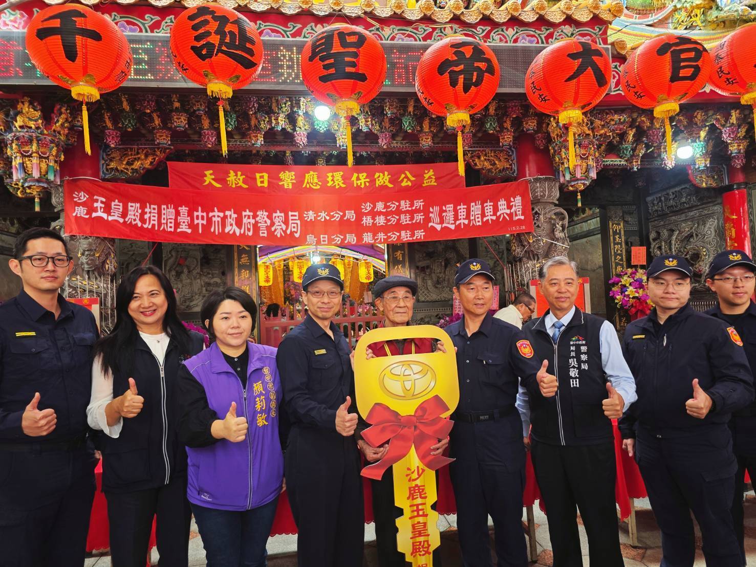 沙鹿玉皇殿28日捐贈乙輛全新警用巡邏車給臺中市政府警察局烏日分局,警察局局長吳敬田及市議會顏副議長到場參加交車儀式,烏日分局也致贈警察公仔給主任委員莊江材,感謝玉皇殿,凝聚情感,保佑平安,消災解厄,庇佑鄉里,回饋社會,令人敬佩。