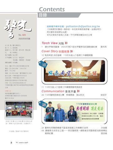 Contents%u76ee%u93048 %u8b66%u5149 2025.8 829%u671f%u5c01%u9762%u5716%uff0f%u5609%u7fa9%u5e02%u653f%u5e9c%u8b66%u5bdf%u5c40%u6295%u7a3f%u96fb%u5b50%u90f5%u4ef6%u4fe1%u7bb1%uff1apolicetorch@police.org.tw%uff08 %u6587%u7ae0%u8acb%u52ff%u6284%u8972%u6216%u4e00%u7a3f%u591a%u6295%uff0c%u672c%u793e%u5c0d%u4f86%u7a3f%u6709%u522a%u4fee%u6b0a%uff0c%u4e26%u8acb%u8a3b%u660e%u5f15%u7528%u6587%u737b%u4f86%u6e90%u6216%u7db2%u5740%u51fa%u8655%uff09%u672c%u520a%u6587%u7ae0%u4fc2%u4f5c%u8005%u500b%u4eba%u8a00%u8ad6%uff0c%u4e0d%u4ee3%u8868%u8b66%u653f%u7f72%u53ca%u672c%u793e%u7acb%u5834%u51fa %u7248 %u8005 / %u8b66%u5149%u96dc%u8a8c%u793e%u767c %u884c %u4eba / %u5f35%u69ae%u8208%u526f%u767c%u884c%u4eba / %u674e%u6587%u7ae0%u3001%u90ed%u58eb%u5091%u3001%u9673%u91d1%u57ce%u793e%u3000%u3000%u9577 / %u6797%u8ecd%u5ef7%u57f7%u884c%u7de8%u8f2f / %u5433%u6b63%u5091%u6587%u5b57%u7de8%u8f2f / %u738b%u4e43%u7389%u3001%u8b1d%u5b9c%u84c9%u3001%u674e%u54c1%u52f3%u3001%u66f9%u5029%u84c9%u3001%u674e%u5a01%u8afa%u651d%u5f71%u7de8%u8f2f / %u6d2a%u6d77%u9a30%u793e%u5740%uff1a%u81fa%u5317%u5e02%u4e2d%u6b63%u5340%u5fe0%u5b5d%u6771%u8def1%u6bb57%u865f%u96fb%u8a71%uff1a02-2393-5858%u30002393-5797%u8b66%u7528%uff1a722-2462%u50b3%u771f%uff1a02-2322-4698%u3000%u8b66%u7528%u50b3%u771f722-2464%u5275%u520a%u65e5%u671f%uff1a%u4e2d%u83ef%u6c11%u570b54%u5e744%u670816%u65e5%u51fa%u7248%u65e5%u671f%uff1a%u4e2d%u83ef%u6c11%u570b114%u5e748%u6708%u65b0%u805e%u5c40%u767b%u8a18%u8b49%u5c40%u7248%u5317%u5e02%u8a8c%u7b2c225%u865f%u5370%u5237%uff1a%u5f69%u4e4b%u574a%u79d1%u6280%u80a1%u4efd%u6709%u9650%u516c%u53f8%u4e2d%u83ef%u90f5%u653f%u81fa%u5317%u96dc%u5b57%u7b2c1086%u865f%u57f7%u7167%u767b%u8a18%u70ba%u96dc%u8a8c%u4ea4%u5bc4%u8a02%u95b1%u65b9%u5f0f%u6bcf%u518a%u552e%u50f9%u65b0%u81fa%u5e63100%u5143%u3002%u8a73%u60c5%u8acb%u6d3d%u8b66%u5149%u96dc%u8a8c%u793e02-23935858%u8b66%u7528722-6934No. 8292025%u5e748%u6708%u865fTorch View %u5149%u9ede1 %u8b93%u4e16%u754c%u770b%u898b%u81fa%u7063%u30002025%u5e74%u7b2c21%u5c46%u4e16%u754c%u8b66%u5bdf%u6d88%u9632%u904b%u52d5%u6703%u7d00%u4e8b %u9ec3%u79cb%u71d5Cover Story %u5c01%u9762%u6545%u4e8b10 %u9ede%u4eae%u5e0c%u671b %u627e%u56de%u6eab%u6696%u3000113%u5e74%u5931%u8e64%u4eba%u53e3%u67e5%u5c0b%u5de5%u4f5c%u7e3e%u512a%u54e1%u8b6610%u672c%u671f%u96dc%u8a8c%u5373%u520a%u767b%u7372%u734e%u540c%u4ec1%u5f97%u734e%u611f%u8a00%uff0c%u4ee5%u80af%u5b9a%u5176%u4ed8%u51fa%u8207%u8f9b%u52de%u3002%u2014113%u5e74%u5931%u8e64%u4eba%u53e3%u67e5%u5c0b%u5de5%u4f5c%u7e3e%u512a%u54e1%u8b6611 113%u5e74%u5931%u8e64%u4eba%u53e3%u67e5%u5c0b%u5de5%u4f5c%u7e3e%u512a%u54e1%u8b66%u5f97%u734e%u611f%u8a00Communication %u610f%u898b%u5e73%u81fa28 114%u5e74%u8b66%u5bdf%u7bc0%u684c%u7403%u6bd4%u8cfd%u3000%u71b1%u60c5%u958b%u5834%u3000%u9802%u5c16%u5c0d%u6c7a %u4faf%u51a0%u5b8728%u70ba%u7dad%u8b77%u540c%u4ec1%u8eab%u5fc3%u5065%u5eb7%uff0c%u57f9%u990a%u5718%u968a%u7cbe%u795e%u53ca%u9f13%u821e%u5de5%u4f5c%u58eb%u6c23%uff0c%u8b66%u653f%u7f72%u8209%u8fa6%u8b66%u5bdf%u7bc0%u684c%u7403%u9326%u6a19%u8cfd114%u5e74%u8b66%u5bdf%u7bc0%u684c%u7403%u6bd4%u8cfd%u71b1%u60c5%u958b%u5834 %u9802%u5c16%u5c0d%u6c7a34 %u8b66%u5bdf%u5229%u7528%u8077%u52d9%u6a5f%u6703%u4e0d%u7576%u67e5%u8a62%u500b%u8cc7%u4e4b%u5211%u4e8b%u8cac%u4efb%u8ff7%u601d %u6d2a%u4fca%u7fa948 %u92fc%u9435%u610f%u5fd7%u5230%u5b89%u5168%u4e4b%u76fe%u2014%u4fdd%u5b89%u8b66%u5bdf%u7b2c%u4e00%u7e3d%u968a%u7dad%u5b89%u7279%u52e4%u968a%u99d0%u5730%u968a%u5fbd%u6a19%u8a8c%u63ed%u724c%u7d00%u5be6 %u66fe%u5955%u7dad%u6211%u570b%u4ee3%u8868%u5718%u5728%u5404%u9805%u7af6%u8cfd%u8868%u73fe%u7cbe%u5f69%u7d55%u502b%uff0c%u52c7%u596a74%u91d142%u928048%u9285%uff0c%u6210%u7e3e%u6590%u7136%u3002