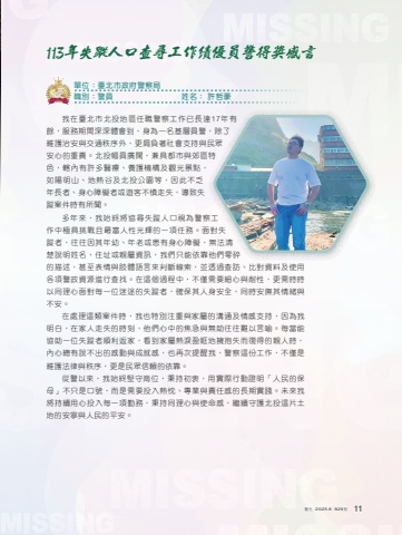%u6211%u5728%u81fa%u5317%u5e02%u5317%u6295%u5730%u5340%u4efb%u8077%u8b66%u5bdf%u5de5%u4f5c%u5df2%u9577%u905417%u5e74%u6709%u9918%uff0c%u670d%u52d9%u671f%u9593%u6df1%u6df1%u9ad4%u6703%u5230%uff0c%u8eab%u70ba%u4e00%u540d%u57fa%u5c64%u54e1%u8b66%uff0c%u9664%u4e86%u7dad%u8b77%u6cbb%u5b89%u8207%u4ea4%u901a%u79e9%u5e8f%u5916%uff0c%u66f4%u80a9%u8ca0%u8457%u793e%u6703%u652f%u6301%u8207%u6c11%u773e%u5b89%u5fc3%u7684%u91cd%u8cac%u3002%u5317%u6295%u5e45%u54e1%u5ee3%u95ca%uff0c%u517c%u5177%u90fd%u5e02%u8207%u90ca%u5340%u7279%u8272%uff0c%u8f44%u5167%u6709%u8a31%u591a%u91ab%u7642%u3001%u990a%u8b77%u6a5f%u69cb%u53ca%u89c0%u5149%u666f%u9ede%uff0c%u5982%u967d%u660e%u5c71%u3001%u5730%u71b1%u8c37%u53ca%u5317%u6295%u516c%u5712%u7b49%uff0c%u56e0%u6b64%u4e0d%u4e4f%u5e74%u9577%u8005%u3001%u8eab%u5fc3%u969c%u7919%u8005%u6216%u904a%u5ba2%u4e0d%u614e%u8d70%u5931%uff0c%u5c0e%u81f4%u5931%u8e64%u6848%u4ef6%u6642%u6709%u6240%u805e%u3002%u591a%u5e74%u4f86%uff0c%u6211%u59cb%u7d42%u5c07%u5354%u5c0b%u5931%u8e64%u4eba%u53e3%u8996%u70ba%u8b66%u5bdf%u5de5%u4f5c%u4e2d%u6975%u5177%u6311%u6230%u4e14%u6700%u5bcc%u4eba%u6027%u5149%u8f1d%u7684%u4e00%u9805%u4efb%u52d9%u3002%u9762%u5c0d%u5931%u8e64%u8005%uff0c%u5f80%u5f80%u56e0%u5176%u5e74%u5e7c%u3001%u5e74%u8001%u6216%u60a3%u6709%u8eab%u5fc3%u969c%u7919%uff0c%u7121%u6cd5%u6e05%u695a%u8aaa%u660e%u59d3%u540d%u3001%u4f4f%u5740%u6216%u89aa%u5c6c%u8cc7%u8a0a%uff0c%u6211%u5011%u53ea%u80fd%u4f9d%u9760%u4ed6%u5011%u96f6%u788e%u7684%u63cf%u8ff0%uff0c%u751a%u81f3%u8868%u60c5%u8207%u80a2%u9ad4%u8a9e%u8a00%u4f86%u5224%u65b7%u7dda%u7d22%uff0c%u4e26%u900f%u904e%u67e5%u8a2a%u3001%u6bd4%u5c0d%u8cc7%u6599%u53ca%u4f7f%u7528%u5404%u9805%u8b66%u653f%u8cc7%u6e90%u9032%u884c%u67e5%u627e%u3002%u5728%u9019%u500b%u904e%u7a0b%u4e2d%uff0c%u4e0d%u50c5%u9700%u8981%u7d30%u5fc3%u8207%u8010%u6027%uff0c%u66f4%u9700%u6642%u6642%u4ee5%u540c%u7406%u5fc3%u9762%u5c0d%u6bcf%u4e00%u4f4d%u8ff7%u9014%u7684%u5931%u8e64%u8005%uff0c%u78ba%u4fdd%u5176%u4eba%u8eab%u5b89%u5168%uff0c%u540c%u6642%u5b89%u64ab%u5176%u60c5%u7dd2%u8207%u4e0d%u5b89%u3002%u5728%u8655%u7406%u9019%u985e%u6848%u4ef6%u6642%uff0c%u6211%u4e5f%u7279%u5225%u6ce8%u91cd%u8207%u5bb6%u5c6c%u7684%u6e9d%u901a%u53ca%u60c5%u611f%u652f%u6301%uff0c%u56e0%u70ba%u6211%u660e%u767d%uff0c%u5728%u5bb6%u4eba%u8d70%u5931%u7684%u6642%u523b%uff0c%u4ed6%u5011%u5fc3%u4e2d%u7684%u7126%u6025%u8207%u7121%u52a9%u5f80%u5f80%u96e3%u4ee5%u8a00%u55bb%u3002%u6bcf%u7576%u80fd%u5354%u52a9%u4e00%u4f4d%u5931%u8e64%u8005%u9806%u5229%u8fd4%u5bb6%uff0c%u770b%u5230%u5bb6%u5c6c%u71b1%u6dda%u76c8%u7736%u5730%u64c1%u62b1%u5931%u800c%u5fa9%u5f97%u7684%u89aa%u4eba%u6642%uff0c%u5167%u5fc3%u7e3d%u6709%u8aaa%u4e0d%u51fa%u7684%u611f%u52d5%u8207%u6210%u5c31%u611f%uff0c%u4e5f%u518d%u6b21%u63d0%u9192%u6211%uff0c%u8b66%u5bdf%u9019%u4efd%u5de5%u4f5c%uff0c%u4e0d%u50c5%u662f%u7dad%u8b77%u6cd5%u5f8b%u8207%u79e9%u5e8f%uff0c%u66f4%u662f%u6c11%u773e%u4fe1%u8cf4%u7684%u4f9d%u9760%u3002%u5f9e%u8b66%u4ee5%u4f86%uff0c%u6211%u59cb%u7d42%u5805%u5b88%u5d17%u4f4d%uff0c%u79c9%u6301%u521d%u8877%uff0c%u7528%u5be6%u969b%u884c%u52d5%u8b49%u660e%u300c%u4eba%u6c11%u7684%u4fdd%u6bcd%u300d%u4e0d%u53ea%u662f%u53e3%u865f%uff0c%u800c%u662f%u9700%u8981%u6295%u5165%u71b1%u5ff1%u3001%u5c08%u696d%u8207%u8cac%u4efb%u611f%u7684%u9577%u671f%u5be6%u8e10%u3002%u672a%u4f86%u6211%u5c07%u6301%u7e8c%u7528%u5fc3%u6295%u5165%u6bcf%u4e00%u9805%u52e4%u52d9%uff0c%u79c9%u6301%u540c%u7406%u5fc3%u8207%u4f7f%u547d%u611f%uff0c%u7e7c%u7e8c%u5b88%u8b77%u5317%u6295%u9019%u7247%u571f%u5730%u7684%u5b89%u5be7%u8207%u4eba%u6c11%u7684%u5e73%u5b89%u3002%u512a %u55ae%u4f4d%uff1a%u81fa%u5317%u5e02%u653f%u5e9c%u8b66%u5bdf%u5c40%u3000%u3000%u8077%u5225%uff1a%u8b66%u54e1 %u59d3%u540d%uff1a %u8a31%u54f2%u8c6a113%u5e74%u5931%u8e64%u4eba%u53e3%u67e5%u5c0b%u5de5%u4f5c%u7e3e%u512a%u54e1%u8b66%u5f97%u734e%u611f%u8a00%u8b66%u5149%u30002025.8%u3000829%u671f 11