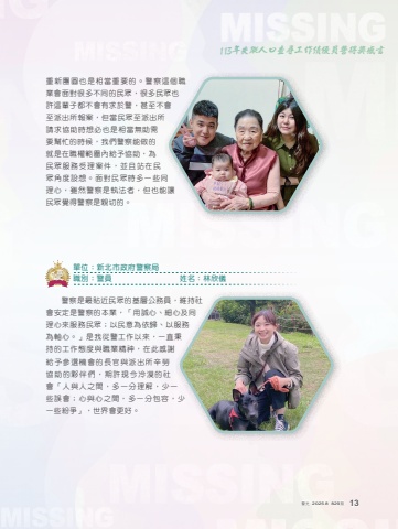 %u8b66%u5bdf%u662f%u6700%u8cbc%u8fd1%u6c11%u773e%u7684%u57fa%u5c64%u516c%u52d9%u54e1%uff0c%u7dad%u6301%u793e%u6703%u5b89%u5b9a%u662f%u8b66%u5bdf%u7684%u672c%u696d%uff0c%u300c%u7528%u8aa0%u5fc3%u3001%u7d30%u5fc3%u53ca%u540c%u7406%u5fc3%u4f86%u670d%u52d9%u6c11%u773e%uff1b%u4ee5%u6c11%u610f%u70ba%u4f9d%u6b78%u3001%u4ee5%u670d%u52d9%u70ba%u8ef8%u5fc3%u3002%u300d%u662f%u6211%u5f9e%u8b66%u5de5%u4f5c%u4ee5%u4f86%uff0c%u4e00%u76f4%u79c9%u6301%u7684%u5de5%u4f5c%u614b%u5ea6%u8207%u8077%u696d%u7cbe%u795e%uff0c%u5728%u6b64%u611f%u8b1d%u7d66%u4e88%u53c3%u9078%u6a5f%u6703%u7684%u9577%u5b98%u8207%u6d3e%u51fa%u6240%u8f9b%u52de%u5354%u52a9%u7684%u5925%u4f34%u5011%uff0c%u671f%u8a31%u73fe%u4eca%u51b7%u6f20%u7684%u793e%u6703%u300c%u4eba%u8207%u4eba%u4e4b%u9593%uff0c%u591a%u4e00%u5206%u7406%u89e3%uff0c%u5c11%u4e00%u4e9b%u8aa4%u6703%uff1b%u5fc3%u8207%u5fc3%u4e4b%u9593%uff0c%u591a%u4e00%u5206%u5305%u5bb9%uff0c%u5c11%u4e00%u4e9b%u7d1b%u722d%u300d%uff0c%u4e16%u754c%u6703%u66f4%u597d%u3002113%u5e74%u5931%u8e64%u4eba%u53e3%u67e5%u5c0b%u5de5%u4f5c%u7e3e%u512a%u54e1%u8b66%u5f97%u734e%u611f%u8a00%u512a %u55ae%u4f4d%uff1a%u65b0%u5317%u5e02%u653f%u5e9c%u8b66%u5bdf%u5c40%u3000%u3000%u8077%u5225%uff1a%u8b66%u54e1 %u59d3%u540d%uff1a%u6797%u6b23%u5100%u91cd%u65b0%u5718%u5713%u4e5f%u662f%u76f8%u7576%u91cd%u8981%u7684%u3002%u8b66%u5bdf%u9019%u500b%u8077%u696d%u6703%u9762%u5c0d%u5f88%u591a%u4e0d%u540c%u7684%u6c11%u773e%uff0c%u5f88%u591a%u6c11%u773e%u4e5f%u8a31%u9019%u8f29%u5b50%u90fd%u4e0d%u6703%u6709%u6c42%u65bc%u8b66%uff0c%u751a%u81f3%u4e0d%u6703%u81f3%u6d3e%u51fa%u6240%u5831%u6848%uff0c%u4f46%u7576%u6c11%u773e%u81f3%u6d3e%u51fa%u6240%u8acb%u6c42%u5354%u52a9%u6642%u60f3%u5fc5%u4e5f%u662f%u76f8%u7576%u7121%u52a9%u9700%u8981%u5e6b%u5fd9%u7684%u6642%u5019%uff0c%u6211%u5011%u8b66%u5bdf%u80fd%u505a%u7684%u5c31%u662f%u5728%u8077%u6b0a%u7bc4%u570d%u5167%u7d66%u4e88%u5354%u52a9%uff0c%u70ba%u6c11%u773e%u670d%u52d9%u53d7%u7406%u6848%u4ef6%uff0c%u4e26%u4e14%u7ad9%u5728%u6c11%u773e%u89d2%u5ea6%u8a2d%u60f3%u3002%u9762%u5c0d%u6c11%u773e%u6642%u591a%u4e00%u4e9b%u540c%u7406%u5fc3%uff0c%u96d6%u7136%u8b66%u5bdf%u662f%u57f7%u6cd5%u8005%uff0c%u4f46%u4e5f%u80fd%u8b93%u6c11%u773e%u89ba%u5f97%u8b66%u5bdf%u662f%u89aa%u5207%u7684%u3002%u8b66%u5149%u30002025.8%u3000829%u671f 13
