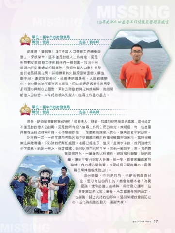 %u80fd%u7372%u9078%u300c%u8b66%u653f%u7f72113%u5e74%u5931%u8e64%u4eba%u53e3%u67e5%u5c0b%u5de5%u4f5c%u7e3e%u512a%u54e1%u8b66%u300d%uff0c%u6df1%u611f%u69ae%u5e78%uff0c%u9019%u4e0d%u50c5%u662f%u5c0d%u500b%u4eba%u5de5%u4f5c%u80af%u5b9a%uff0c%u66f4%u662f%u5c0d%u7121%u6578%u5f9e%u4e8b%u5354%u5c0b%u5de5%u4f5c%u7684%u5925%u4f34%u5011%u4e00%u7a2e%u9f13%u52f5%u3002%u6211%u56e0%u5e73%u65e5%u65bc%u6d3e%u51fa%u6240%u5f9e%u4e8b%u5a66%u5e7c%u76f8%u95dc%u696d%u52d9%uff0c%u767c%u73fe%u5931%u8e64%u4eba%u53e3%u6848%u4ef6%u5e38%u767c%u751f%u65bc%u8001%u5f31%u5a66%u5b7a%u4e4b%u9593%uff0c%u8a73%u7d30%u77ad%u89e3%u5176%u5931%u8e64%u539f%u56e0%u5e38%u56e0%u500b%u4eba%u50f9%u503c%u89c0%u4e0d%u540c%uff0c%u5c0e%u81f4%u5bb6%u5ead%u5931%u548c%u3001%u793e%u6703%u9023%u7d50%u611f%u7f3a%u5931%u3001%u5927%u8166%u7d50%u69cb%u8b8a%u5316%u3001%u8eab%u5fc3%u9748%u7121%u6cd5%u5e73%u8861%u7b49%u56e0%u7d20%u6240%u81f4%u3002%u56e0%u6b64%u8655%u7406%u662f%u985e%u6848%u4ef6%u5e38%u9700%u66f4%u591a%u540c%u7406%u5fc3%u8207%u8010%u5fc3%u53bb%u9762%u5c0d%uff0c%u79c9%u6301%u53bb%u9664%u81ea%u6211%u8207%u4e4b%u5171%u611f%u7cbe%u795e%uff0c%u62b1%u6301%u5e6b%u52a9%u4ed6%u4eba%u7684%u57f7%u5ff5%uff0c%u672a%u4f86%u5c07%u6301%u7e8c%u70ba%u5931%u8e64%u4eba%u53e3%u67e5%u5c0b%u5de5%u4f5c%u76e1%u5fc3%u76e1%u529b%u3002%u9996%u5148%uff0c%u80fd%u5920%u69ae%u7372%u8b66%u653f%u7f72%u9812%u767c%u7684%u300c%u5354%u5c0b%u9054%u4eba%u300d%u6b8a%u69ae%uff0c%u6211%u611f%u5230%u975e%u5e38%u69ae%u5e78%u8207%u611f%u6fc0%uff1b%u9019%u4efd%u80af%u5b9a%u4e0d%u50c5%u662f%u5c0d%u6211%u500b%u4eba%u7684%u9f13%u52f5%uff0c%u66f4%u662f%u5c0d%u6240%u6709%u6295%u5165%u5354%u5c0b%u5de5%u4f5c%u540c%u4ec1%u5011%u7684%u80af%u5b9a%u3002%u6211%u76f8%u4fe1%uff0c%u6bcf%u4e00%u4f4d%u57fa%u5c64%u54e1%u8b66%u5728%u9762%u5c0d%u5354%u5c0b%u6848%u4ef6%u6642%uff0c%u5fc3%u4e2d%u60f3%u7684%u90fd%u662f%u2014%u600e%u9ebc%u6a23%u80fd%u8b93%u5bb6%u4eba%u653e%u5fc3%u3001%u8b93%u5931%u8e64%u8005%u5e73%u5b89%u56de%u5bb6%u3002%u8a18%u5f97%u6709%u4e00%u6b21%uff0c%u4e00%u4f4d%u5e74%u9081%u7684%u8001%u5ad7%u56e0%u627e%u4e0d%u5230%u89aa%u621a%u800c%u88ab%u8a08%u7a0b%u8eca%u53f8%u6a5f%u8f09%u4f86%u6d3e%u51fa%u6240%uff0c%u7576%u6642%u53f8%u6a5f%u7121%u6cd5%u8207%u5979%u6e9d%u901a%uff0c%u53ea%u597d%u8acb%u6211%u5011%u5e6b%u5fd9%u8655%u7406%u3002%u8001%u5ad7%u5df2%u7d93%u8d70%u4e86%u4e00%u6574%u5929%uff0c%u4e14%u6ef4%u6c34%u672a%u98f2%uff0c%u6211%u5011%u8acb%u5979%u5148%u5750%u4e0b%u6b47%u606f%uff0c%u7d66%u5979%u4e00%u676f%u6c34%uff0c%u7a69%u5b9a%u60c5%u7dd2%uff1b%u5979%u53ea%u8a18%u5f97%u81ea%u5df1%u7684%u5168%u540d%uff0c%u5176%u4ed6%u4e00%u6982%u8aaa%u4e0d%u4e0a%u4f86%u3002%u6211%u5011%u9760%u8457%u9019%u500b%u59d3%u540d%uff0c%u4e00%u7b46%u7b46%u53bb%u6bd4%u5c0d%u8cc7%u6599%uff0c%u7d42%u65bc%u9806%u5229%u806f%u7e6b%u4e0a%u5979%u7684%u5bb6%u5c6c%uff0c%u8b93%u5979%u5e73%u5b89%u56de%u5230%u5bb6%u4eba%u8eab%u908a%u3002%u90a3%u4e00%u523b%uff0c%u770b%u8457%u5bb6%u5c6c%u611f%u6fc0%u7684%u795e%u60c5%uff0c%u6211%u5fc3%u88e1%u975e%u5e38%u8e0f%u5be6%uff0c%u4e5f%u66f4%u76f8%u4fe1%u53ea%u8981%u80af%u7528%u5fc3%uff0c%u518d%u56f0%u96e3%u7684%u6848%u4ef6%u4e5f%u80fd%u627e%u5230%u51fa%u53e3%u3002%u9019%u4efd%u69ae%u8b7d%uff0c%u4e0d%u53ea%u662f%u6211%u7684%uff0c%u4e5f%u662f%u6240%u6709%u9858%u610f%u4ed8%u51fa%u3001%u5805%u5b88%u5d17%u4f4d%u7684%u540c%u4ec1%u7684%u3002%u6211%u6703%u7e7c%u7e8c%u672c%u8457%u300c%u70ba%u6c11%u670d%u52d9%u3001%u4f7f%u547d%u5fc5%u9054%u300d%u7684%u7cbe%u795e%uff0c%u7528%u884c%u52d5%u5b88%u8b77%u6bcf%u4e00%u4f4d%u9700%u8981%u5e6b%u52a9%u7684%u6c11%u773e%uff1b%u6700%u5f8c%uff0c%u518d%u6b21%u611f%u8b1d%u9577%u5b98%u7684%u80af%u5b9a%uff0c%u4e5f%u8b1d%u8b1d%u4e00%u8def%u4e0a%u652f%u6301%u6211%u7684%u5925%u4f34%u3002%u9019%u4efd%u69ae%u8000%u6211%u6703%u9298%u8a18%u5728%u5fc3%uff0c%u4e26%u5316%u70ba%u524d%u9032%u7684%u52d5%u529b%uff0c%u8b1d%u8b1d%u5927%u5bb6%u3002113%u5e74%u5931%u8e64%u4eba%u53e3%u67e5%u5c0b%u5de5%u4f5c%u7e3e%u512a%u54e1%u8b66%u5f97%u734e%u611f%u8a00%u512a %u55ae%u4f4d%uff1a%u81fa%u4e2d%u5e02%u653f%u5e9c%u8b66%u5bdf%u5c40%u3000%u3000%u8077%u5225%uff1a%u8b66%u54e1 %u59d3%u540d%uff1a%u5289%u5b87%u8ed2%u512a %u55ae%u4f4d%uff1a%u81fa%u4e2d%u5e02%u653f%u5e9c%u8b66%u5bdf%u5c40%u3000%u3000%u8077%u5225%uff1a%u8b66%u54e1 %u59d3%u540d%uff1a%u6797%u5176%u92d2%u8b66%u5149%u30002025.8%u3000829%u671f 17