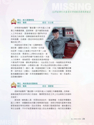 %u975e%u5e38%u69ae%u5e78%u80fd%u7372%u5f97%u300c%u8b66%u653f%u7f72113%u5e74%u5931%u8e64%u4eba%u53e3%u67e5%u5c0b%u5de5%u4f5c%u7e3e%u512a%u54e1%u8b66%u300d%u9019%u9805%u6b8a%u69ae%uff0c%u9019%u4e0d%u50c5%u662f%u5c0d%u6211%u500b%u4eba%u5de5%u4f5c%u7684%u80af%u5b9a%uff0c%u66f4%u8c61%u5fb5%u8457%u6211%u6295%u5165%u8b66%u754c6%u5e74%u591a%u4f86%u7684%u52aa%u529b%u8207%u6210%u679c%u3002%u8aa0%u646f%u611f%u8b1d%u5404%u7d1a%u9577%u5b98%u7684%u652f%u6301%u8207%u63a8%u85a6%uff0c%u4e5f%u611f%u8b1d%u4e00%u8def%u8d70%u4f86%u8207%u6211%u4e26%u80a9%u4f5c%u6230%u7684%u540c%u4ec1%u5011%u3002%u6211%u8a8d%u70ba%u6211%u53ea%u662f%u505a%u4e86%u6bcf%u4e00%u4f4d%u8b66%u5bdf%u90fd%u5728%u505a%u7684%u4e8b%uff0c%u76e1%u6700%u5927%u7684%u52aa%u529b%uff0c%u627e%u56de%u6bcf%u4e00%u4f4d%u5931%u8e64%u7684%u6c11%u773e%u3002%u5931%u8e64%u4eba%u53e3%u67e5%u5c0b%u5de5%u4f5c%u5f9e%u4f86%u4e0d%u662f%u4e00%u4eba%u80fd%u5b8c%u6210%u7684%u4efb%u52d9%uff0c%u9700%u8981%u540c%u4ec1%u4e4b%u9593%u76f8%u4e92%u7684%u914d%u5408%u3001%u5bb6%u5c6c%u7684%u4fe1%u4efb%uff0c%u4ee5%u53ca%u6211%u5011%u6301%u7e8c%u4e0d%u653e%u68c4%u7684%u4fe1%u5ff5%u3002%u5931%u8e64%u4eba%u53e3%u7684%u6848%u4ef6%uff0c%u80cc%u5f8c%u90fd%u662f%u4e00%u500b%u5bb6%u5ead%u7684%u7126%u6025%u8207%u76fc%u671b%u3002%u53ea%u8981%u6211%u5011%u4e0d%u653e%u68c4%uff0c%u54ea%u6015%u5e0c%u671b%u518d%u6e3a%u5c0f%uff0c%u4e5f%u5fc5%u9808%u5168%u529b%u4ee5%u8d74%u3002%u6bcf%u7576%u770b%u5230%u6c11%u773e%u7126%u6025%u7684%u8dd1%u9032%u6d3e%u51fa%u6240%u5831%u6848%uff0c%u5fc3%u88e1%u611f%u5230%u5fc3%u9178%uff0c%u6240%u4ee5%u6211%u5fc5%u9808%u7528%u540c%u7406%u5fc3%u548c%u8010%u5fc3%u53bb%u5e6b%u5fd9 %uff0c%u54ea%u6015%u76e3%u8996%u5668%u770b%u4e86%u4e00%u904d%u53c8%u4e00%u904d%uff0c%u540c%u9053%u689d%u8def%u7e5e%u4e86%u53c8%u7e5e%uff0c%u53ea%u70ba%u4e86%u8b93%u5bb6%u5c6c%u5011%u76e1%u5feb%u5718%u805a%u3002%u6216%u8a31%u6211%u591a%u4e00%u5206%u95dc%u5fc3%uff0c%u4e5f%u80fd%u8b93%u6c11%u773e%u66f4%u5b89%u5fc3%uff0c%u6bcf%u4e00%u6b21%u6210%u529f%u7684%u5c0b%u7372%uff0c%u90fd%u662f%u63a8%u52d5%u6211%u7e7c%u7e8c%u524d%u9032%u7684%u529b%u91cf%u3002%u672a%u4f86%u6211%u6703%u7e7c%u7e8c%u5805%u5b88%u5d17%u4f4d%uff0c%u4e0d%u5fd8%u521d%u5fc3%uff0c%u505a%u4e00%u540d%u503c%u5f97%u4eba%u6c11%u4fe1%u8cf4%u7684%u8b66%u5bdf%u3002%u5f88%u69ae%u5e78%u80fd%u7372%u5f97%u300c%u8b66%u653f%u7f72113%u5e74%u5ea6%u5931%u8e64%u4eba%u53e3%u67e5%u5c0b%u5de5%u4f5c%u7e3e%u512a%u54e1%u8b66%u300d%u7684%u6b8a%u69ae%uff0c%u611f%u8b1d%u5404%u7d1a%u9577%u5b98%u53ca%u6240%u5167%u540c%u4ec1%u7684%u5354%u52a9%uff0c%u7372%u734e%u662f%u5c0d%u6211%u5728%u5de5%u4f5c%u4e0a%u4ed8%u51fa%u8207%u52aa%u529b%u7684%u8a8d%u540c%u53ca%u80af%u5b9a%u3002%u8eab%u70ba%u7b2c%u4e00%u7dda%u57f7%u52e4%u4eba%u54e1%uff0c%u53d7%u7406%u5230%u8ff7%u9014%u8d70%u5931%u3001%u667a%u80fd%u969c%u7919%u3001%u5931%u667a%u75c7%u7b49%u7a2e%u7a2e%u5931%u8e64%u4eba%u53e3%u6848%u4ef6%uff0c%u5bb6%u5c6c%u8457%u6025%u5730%u5411%u8b66%u65b9%u5831%u6848%u8acb%u6c42%u5354%u52a9%uff0c%u6211%u660e%u767d%u6bcf%u500b%u5931%u8e64%u6848%u4ef6%u80cc%u5f8c%u90fd%u662f%u5bb6%u5ead%u7684%u7b49%u5f85%u53ca%u671f%u76fc%u3002%u56e0%u6b64%u53d7%u7406%u5f8c%uff0c%u5229%u7528%u8def%u53e3%u76e3%u8996%u5668%u7cfb%u7d71%u3001%u57fa%u5730%u81fa%u5b9a%u4f4d%u7b49%u65b9%u6cd5%u5354%u5c0b%uff0c%u4e0d%u5916%u4e4e%u5c31%u662f%u8981%u78ba%u4fdd%u5931%u8e64%u4eba%u7684%u751f%u547d%u8eab%u9ad4%u5b89%u5168%u3002%u6bcf%u6b21%u6210%u529f%u5c0b%u7372%u5931%u512a %u55ae%u4f4d%uff1a%u5357%u6295%u7e23%u653f%u5e9c%u8b66%u5bdf%u5c40%u3000%u3000%u8077%u5225%uff1a%u8b66%u54e1 %u59d3%u540d%uff1a%u5f35%u5bb6%u6995113%u5e74%u5931%u8e64%u4eba%u53e3%u67e5%u5c0b%u5de5%u4f5c%u7e3e%u512a%u54e1%u8b66%u5f97%u734e%u611f%u8a00%u512a %u55ae%u4f4d%uff1a%u5f70%u5316%u7e23%u8b66%u5bdf%u5c40%u3000%u3000%u8077%u5225%uff1a%u8b66%u54e1 %u59d3%u540d%uff1a%u738b%u58eb%u9298%u8b66%u5149%u30002025.8%u3000829%u671f 23