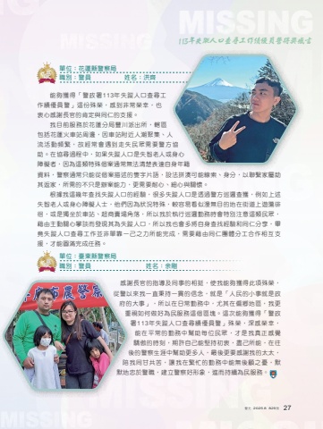 %u80fd%u5920%u7372%u5f97%u300c%u8b66%u653f%u7f72113%u5e74%u5931%u8e64%u4eba%u53e3%u67e5%u5c0b%u5de5%u4f5c%u7e3e%u512a%u54e1%u8b66%u300d%u9019%u4efd%u6b8a%u69ae%uff0c%u611f%u5230%u975e%u5e38%u69ae%u5e78%uff0c%u4e5f%u8877%u5fc3%u611f%u8b1d%u9577%u5b98%u7684%u80af%u5b9a%u8207%u540c%u4ec1%u7684%u652f%u63f4%u3002%u6211%u76ee%u524d%u670d%u52d9%u65bc%u82b1%u84ee%u5206%u5c40%u8c50%u5ddd%u6d3e%u51fa%u6240%uff0c%u8f44%u5340%u5305%u62ec%u82b1%u84ee%u706b%u8eca%u7ad9%u5468%u908a%uff0c%u56e0%u8eca%u7ad9%u9644%u8fd1%u4eba%u6f6e%u805a%u96c6%u3001%u4eba%u6d41%u6d3b%u52d5%u983b%u7e41%uff0c%u6545%u7d93%u5e38%u6703%u9047%u5230%u8d70%u5931%u6c11%u773e%u9700%u8981%u8b66%u65b9%u5354%u52a9%u3002%u5728%u5354%u5c0b%u904e%u7a0b%u4e2d%uff0c%u5982%u679c%u5931%u8e64%u4eba%u53e3%u662f%u5931%u667a%u8001%u4eba%u6216%u8eab%u5fc3%u969c%u7919%u8005%uff0c%u56e0%u70ba%u9019%u985e%u7279%u6b8a%u500b%u6848%u901a%u5e38%u7121%u6cd5%u6e05%u695a%u8868%u9054%u81ea%u8eab%u5e74%u7c4d%u8cc7%u6599%uff0c%u8b66%u5bdf%u901a%u5e38%u53ea%u80fd%u5f9e%u500b%u6848%u63cf%u8ff0%u7684%u96bb%u5b57%u7247%u8a9e%uff0c%u8a2d%u6cd5%u62fc%u6e4a%u53ef%u80fd%u7dda%u7d22%u3001%u8eab%u5206%uff0c%u4ee5%u806f%u7e6b%u5bb6%u5c6c%u52a9%u5176%u8fd4%u5bb6%uff0c%u6240%u9700%u7684%u4e0d%u53ea%u662f%u8fa6%u6848%u80fd%u529b%uff0c%u66f4%u9700%u8981%u8010%u5fc3%u3001%u7d30%u5fc3%u8207%u95dc%u61f7%u3002%u6839%u64da%u6211%u9019%u5e7e%u5e74%u67e5%u627e%u5931%u8e64%u4eba%u53e3%u7684%u7d93%u9a57%uff0c%u5f88%u591a%u5931%u8e64%u4eba%u53e3%u662f%u900f%u904e%u8b66%u65b9%u5de1%u908f%u67e5%u7372%uff0c%u4f8b%u5982%u4e0a%u8ff0%u5931%u667a%u8001%u4eba%u6216%u8eab%u5fc3%u969c%u7919%u4eba%u58eb%uff0c%u4ed6%u5011%u56e0%u70ba%u72c0%u6cc1%u7279%u6b8a%uff0c%u8f03%u5bb9%u6613%u770b%u4f3c%u6f2b%u7121%u76ee%u7684%u5730%u5728%u8857%u9053%u4e0a%u904a%u8569%u5f98%u5f8a%uff0c%u6216%u662f%u7368%u5750%u65bc%u8eca%u7ad9%u3001%u8d85%u5546%u8ce3%u5834%u89d2%u843d%uff0c%u6240%u4ee5%u6211%u65bc%u57f7%u884c%u5de1%u908f%u52e4%u52d9%u6642%u6703%u7279%u5225%u6ce8%u610f%u9019%u985e%u6c11%u773e%uff0c%u85c9%u7531%u4e3b%u52d5%u95dc%u5fc3%u6500%u8ac7%u800c%u767c%u73fe%u5176%u70ba%u5931%u8e64%u4eba%u53e3%uff0c%u6240%u4ee5%u6211%u4e5f%u6703%u591a%u5c07%u81ea%u8eab%u67e5%u627e%u7d93%u9a57%u548c%u540c%u4ec1%u5206%u4eab%uff0c%u7562%u7adf%u5931%u8e64%u4eba%u53e3%u67e5%u5c0b%u5de5%u4f5c%u4e26%u975e%u55ae%u9760%u4e00%u5df1%u4e4b%u529b%u6240%u80fd%u5b8c%u6210%uff0c%u9700%u8981%u85c9%u7531%u540c%u4ec1%u5718%u9ad4%u5206%u5de5%u5408%u4f5c%u76f8%u4e92%u652f%u63f4%uff0c%u624d%u80fd%u5713%u6eff%u5b8c%u6210%u4efb%u52d9%u3002%u611f%u8b1d%u9577%u5b98%u7684%u6307%u5c0e%u53ca%u540c%u4e8b%u7684%u76f8%u633a%uff0c%u4f7f%u6211%u80fd%u5920%u7372%u5f97%u6b64%u9805%u6b8a%u69ae%uff0c%u5f9e%u8b66%u4ee5%u4f86%u6211%u4e00%u76f4%u79c9%u6301%u4e00%u8cab%u7684%u4fe1%u5ff5%uff0c%u5c31%u662f%u300c%u4eba%u6c11%u7684%u5c0f%u4e8b%u5c31%u662f%u653f%u5e9c%u7684%u5927%u4e8b%u300d%uff0c%u6240%u4ee5%u5728%u65e5%u5e38%u52e4%u52d9%u4e2d%uff0c%u5c24%u5176%u5728%u504f%u9109%u5730%u5340%uff0c%u6211%u66f4%u91cd%u8996%u5982%u4f55%u505a%u597d%u70ba%u6c11%u670d%u52d9%u9019%u500b%u5340%u584a%u3002%u9019%u6b21%u80fd%u5920%u7372%u5f97%u300c%u8b66%u653f%u7f72113%u5e74%u5931%u8e64%u4eba%u53e3%u67e5%u5c0b%u7e3e%u512a%u54e1%u8b66%u300d%u6b8a%u69ae%uff0c%u6df1%u611f%u69ae%u5e78%uff0c%u80fd%u5728%u5e73%u5e38%u7684%u52e4%u52d9%u4e2d%u5e6b%u52a9%u6bcf%u4f4d%u6c11%u773e%uff0c%u624d%u662f%u6211%u771f%u6b63%u611f%u89ba%u9a55%u50b2%u7684%u6642%u523b%uff0c%u671f%u8a31%u81ea%u5df1%u80fd%u5805%u6301%u521d%u8877%uff0c%u76e1%u5df1%u6240%u80fd%uff0c%u5728%u5f80%u5f8c%u7684%u8b66%u5bdf%u751f%u6daf%u4e2d%u5e6b%u52a9%u66f4%u591a%u4eba%uff0c%u6700%u5f8c%u66f4%u8981%u611f%u8b1d%u6211%u7684%u592a%u592a%uff0c%u966a%u6211%u540c%u7518%u5171%u82e6%uff0c%u8b93%u6211%u5728%u7e41%u5fd9%u7684%u52e4%u52d9%u4e2d%u80fd%u7121%u5f8c%u9867%u4e4b%u6182%uff0c%u9ed8%u9ed8%u5730%u5fe0%u65bc%u8b66%u8077%uff0c%u5efa%u7acb%u8b66%u5bdf%u597d%u5f62%u8c61%uff0c%u9032%u800c%u6301%u7e8c%u70ba%u6c11%u670d%u52d9%u3002%u512a %u55ae%u4f4d%uff1a%u82b1%u84ee%u7e23%u8b66%u5bdf%u5c40%u3000%u3000%u8077%u5225%uff1a%u8b66%u54e1 %u59d3%u540d%uff1a%u6d2a%u9f4a%u512a %u55ae%u4f4d%uff1a%u81fa%u6771%u7e23%u8b66%u5bdf%u5c40%u3000%u3000%u8077%u5225%uff1a%u8b66%u54e1 %u59d3%u540d%uff1a%u4f59%u525b113%u5e74%u5931%u8e64%u4eba%u53e3%u67e5%u5c0b%u5de5%u4f5c%u7e3e%u512a%u54e1%u8b66%u5f97%u734e%u611f%u8a00%u8b66%u5149%u30002025.8%u3000829%u671f 27