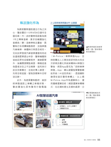 %u57f7%u6cd5%u5f37%u5316%u4f5c%u70ba%u70ba%u5c55%u73fe%u8b66%u5bdf%u904f%u963b%u9055%u6cd5%u884c%u70ba%u4e4b%u6c7a%u5fc3%uff0c%u8b66%u653f%u7f72%u65bc113%u5e748%u67088%u65e5%u901a%u4ee4%u5168%u570b%u5404%u7e23%uff08%u5e02%uff09%u653f%u5e9c%u8b66%u5bdf%u5c40%u555f%u52d5%u70ba%u671f1%u5e74%u4e4b%u5c08%u6848%u67e5%u7ddd%uff0c%u8981%u6c42%u5404%u6a5f%u95dc%u5f37%u5316%u67e5%u7ddd%u507d%uff08%u8b8a%uff09%u9020%u8eca%u724c%u57f7%u6cd5%u91cf%u80fd%uff0c%u54e1%u8b66%u57f7%u884c%u5404%u9805%u6514%u6aa2%u52e4%u52d9%u6642%uff0c%u52a0%u5f37%u8fa8%u8b58%u6c7d%u8eca%u8eca%u724c%u3001%u8eca%u9ad4%u8207%u884c%u7167%u662f%u5426%u76f8%u7b26%u3002%u53e6%u5982%u6c11%u773e%u767c%u73fe%u6c7d%u8eca%u865f%u724c%u906d%u5192%u7528%u800c%u6536%u5230%u9055%u898f%u7f70%u55ae%u63d0%u51fa%u7533%u8a34%uff0c%u8b66%u5bdf%u6a5f%u95dc%u9664%u5354%u52a9%u6c11%u773e%u5b8c%u6210%u5831%u6848%u7a0b%u5e8f%uff0c%u64a4%u92b7%u7f70%u55ae%u5916%uff0c%u5f8c%u7e8c%u61c9%u8abf%u95b1%u76e3%u8996%u5668%uff0c%u7a4d%u6975%u8ffd%u67e5%u507d%u5192%u8005%u6d89%u53ca%u4e4b%u4e0d%u6cd5%u60c5%u4e8b%uff0c%u8ffd%u7a76%u5176%u884c%u653f%u53ca%u5211%u4e8b%u8cac%u4efb%uff0c%u4e26%u6307%u5b9a%u5c08%u4eba%u8fa6%u7406%uff0c%u5217%u518a%u5168%u7a0b%u8ffd%u8e64%u3001%u7ba1%u5236%u8a72%u985e%u6848%u4ef6%u81f3%u79fb%u9001%u6cd5%u8fa6%u3002%u6b64%u5916%uff0c%u70ba%u4f7f%u54e1%u8b66%u57f7%u52e4%u6642%uff0c%u80fd%u5373%u6642%u8fa8%u8b58%u9053%u8def%u4e0a%u8eca%u8f1b%u4e4b%u8eca%u7c4d%u72c0%u614b%uff0c%u8b66%u653f%u7f72%u5f37%u5316%u539f%u6709%u8b66%u7528%u884c%u52d5%u96fb%u8166%uff08M-Police%uff09%u8eca%u724c%u8fa8%u8b58App%uff0c%u4e26%u8207%u8ca1%u5718%u6cd5%u4eba%u5de5%u696d%u6280%u8853%u7814%u7a76%u9662%u5171%u540c%u591a%u6b21%u7814%u5546%u53ca%u512a%u5316%u7cfb%u7d71%u67b6%u69cb%u8207AI%u8fa8%u8b58%u5f15%u64ce%u5f8c%uff0c%u5c07%u539fApp%u66f4%u540d%u70ba%u300c%u5373%u6642%u8eca%u724c%u8fa8%u8b58%u300dApp%uff0c%u8f14%u4ee5%u5efa%u7f6e%u667a%u6167%u8b66%u52e4%u8f14%u52a9%u7cfb%u7d71%uff08AI%u5de1%u9632%u7cfb%u7d71%uff09%uff0c%u900f%u904e%u651d%u5f71%u93e1%u982d%u5b89%u88dd%u65bc%u8b66%u7528%u8eca%u8f1b%u4e0a%uff0c%u4ee5%u4e0a%u63edM-Police App%u4f5c%u70ba%u904b%u7b97%u6838%u5fc3%uff0c%u904b%u7528%u908a%u7de3%u904b%u7b97%u6280%u8853%uff08%u7db2%u8def%u904b%u7b97%u67b6%u69cb%u6a21%u5f0f%uff0c%u62c9%u8fd1%u8cc7%u6599%u7522%u751f%u53ca%u8cc7%u6599%u8655%u7406%u3001%u5206%u25bc%u667a%u6167%u8b66%u52e4%u8f14%u52a9%u7cfb%u7d71%uff08%u5716%uff0f%u8b66%u653f%u7f72%u6559%u80b2%u8a13%u7df4%u7c21%u5831%uff09%u25bc%u8eca%u724c%u8fa8%u8b58%u7cfb%u7d71%u6559%u5b78%u756b%u9762%uff08%u5716%uff0f%u8b66%u653f%u7f72%u6559%u80b2%u8a13%u7df4%u7c21%u5831%uff09%u8b66%u5149%u30002025.8%u3000829%u671f 55