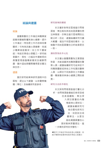 %u8b66%u5149%u30002025.8%u3000829%u671f 69%u7d50%u8ad6%u8207%u5efa%u8b70%u7d50%u8ad6%u57fa%u5c64%u54e1%u8b66%u7684%u5de5%u4f5c%u6eff%u8db3%u8207%u8077%u696d%u5bb6%u5ead%u885d%u7a81%u986f%u8457%u5f71%u97ff%u5176%u8eab%u5fc3%u5065%u5eb7%u3002%u63d0%u5347%u5de5%u4f5c%u6eff%u8db3%uff08%u7279%u5225%u662f%u5de5%u4f5c%u5167%u5bb9%u8207%u540c%u4e8b%u95dc%u4fc2%uff09%u53ef%u6709%u6548%u6539%u5584%u5fc3%u7406%u5065%u5eb7%uff0c%u800c%u6e1b%u5c11%u8077%u696d%u5bb6%u5ead%u885d%u7a81%uff08%u5982%u5de5%u4f5c%u5e72%u64fe%u5bb6%u5ead%uff09%u6709%u52a9%u65bc%u964d%u4f4e%u5fc3%u7406%u58d3%u529b%u3002%u7814%u7a76%u7d50%u679c%u986f%u793a%uff0c%u7537%u6027%u3001%u5df2%u5a5a%u53ca%u5e74%u8cc7%u8f03%u9577%u7684%u54e1%u8b66%u66f4%u6613%u9762%u81e8%u8077%u5bb6%u885d%u7a81%u53ca%u5065%u5eb7%u554f%u984c%uff0c%u986f%u793a%u9019%u4e9b%u7fa4%u9ad4%u9700%u7372%u5f97%u66f4%u591a%u95dc%u6ce8%u8207%u652f%u6301%u3002%u5efa%u8b70%u57fa%u65bc%u7814%u7a76%u7d50%u679c%u8207%u7814%u7a76%u904e%u7a0b%u4e2d%u7684%u9650%u5236%uff0c%u63d0%u51fa%u4ee5%u4e0b%u5efa%u8b70%uff0c%u4ee5%u4f9b%u8b66%u5bdf%u6a5f%u95dc%uff08%u55ae%u4f4d%uff09%u53ca%u5f8c%u7e8c%u7814%u7a76%u8005%u53c3%u8003%uff1a%u7814%u7a76%u5340%u57df%u7684%u64f4%u5c55%u672c%u6587%u50c5%u91dd%u5c0d%u7279%u5b9a%u5340%u57df%u9032%u884c%u554f%u5377%u8abf%u67e5%uff0c%u7121%u6cd5%u63a8%u77e5%u5176%u4ed6%u5730%u5340%u54e1%u8b66%u7684%u60f3%u6cd5%u8207%u614b%u5ea6%uff0c%u4ea6%u7121%u6cd5%u9032%u884c%u5340%u57df%u9593%u7684%u6bd4%u8f03%u5206%u6790%u3002%u56e0%u6b64%uff0c%u5efa%u8b70%u5f8c%u7e8c%u7814%u7a76%u53ef%u64f4%u5927%u7bc4%u570d%uff0c%u589e%u52a0%u4e0d%u540c%u5340%u57df%u7684%u6a23%u672c%uff0c%u4ee5%u6aa2%u9a57%u4e0d%u540c%u5730%u5340%u54e1%u8b66%u7684%u5206%u6790%u7d50%u679c%u662f%u5426%u4e00%u81f4%u3002%u8abf%u67e5%u5c0d%u8c61%u7684%u591a%u5143%u5316%u672c%u6587%u50c5%u4ee5%u57fa%u5c64%u54e1%u8b66%u70ba%u4e3b%u8981%u8abf%u67e5%u5c0d%u8c61%uff0c%u672a%u80fd%u6db5%u84cb%u5176%u4ed6%u8077%u52d9%u5c64%u7d1a%u7684%u8b66%u5bdf%u4eba%u54e1%u3002%u5efa%u8b70%u5f8c%u7e8c%u7814%u7a76%u53ef%u5ef6%u4f38%u81f3%u4e0d%u540c%u8077%u52d9%u5c64%u7d1a%u6216%u5176%u4ed6%u5de5%u4f5c%u6027%u8cea%u7684%u8b66%u5bdf%u4eba%u54e1%uff0c%u4ee5%u63a2%u8a0e%u4e0d%u540c%u65cf%u7fa4%u7684%u5de5%u4f5c%u50f9%u503c%u89c0%u3001%u8077%u5bb6%u885d%u7a81%u8207%u8eab%u5fc3%u5065%u5eb7%u4e4b%u9593%u7684%u5dee%u7570%u3002%u7814%u7a76%u65b9%u6cd5%u7684%u591a%u6a23%u5316%u672c%u6587%u63a1%u7528%u554f%u5377%u8abf%u67e5%u9032%u884c%u91cf%u5316%u5206%u6790%uff0c%u4f46%u554f%u5377%u8abf%u67e5%u50c5%u80fd%u53cd%u6620%u53d7%u8a2a%u8005%u7684%u8868%u9762%u89c0%u9ede%uff0c%u7121%u6cd5%u6df1%u5165%u63a2%u8a0e%u54e1%u8b66%u7684%u5167%u96b1%u614b%u5ea6%u8207%u5fc3%u7406%u72c0%u6cc1%u3002%u5efa%u8b70%u5f8c%u7e8c%u7814%u7a76%u53ef%u7d50%u5408%u8cea%u6027%u7814%u7a76%u65b9%u6cd5%uff0c%u5982%u8a2a%u8ac7%u6cd5%u6216%u89c0%u5bdf%u6cd5%uff0c%u4ee5%u66f4%u5168%u9762%u5730%u63ed%u9732%u54e1%u8b66%u7684%u5fc3%u7406%u72c0%u614b%u8207%u6df1%u5c64%u60f3%u6cd5%uff0c%u9032%u4e00%u6b65%u88dc%u5145%u7814%u7a76%u7684%u5b8c%u6574%u6027%u3002%u25bc%u63d0%u5347%u5de5%u4f5c%u6eff%u8db3%u53ef%u6709%u6548%u6539%u5584%u5fc3%u7406%u5065%u5eb7%uff0c%u800c%u6e1b%u5c11%u8077%u696d%u5bb6%u5ead%u885d%u7a81%u6709%u52a9%u65bc%u964d%u4f4e%u5fc3%u7406%u58d3%u529b