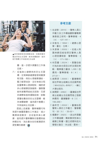 %u8b66%u5149%u30002025.8%u3000829%u671f 71%u53c3%u8003%u6587%u737b1. %u4f0d%u59ff%u84c9%uff082010%uff09%u3002%u8b66%u5bdf%u4eba%u54e1%u5de5%u4f5c%u58d3%u529b%u53ca%u5de5%u4f5c%u50f9%u503c%u89c0%u5f71%u97ff%u8077%u696d%u6eff%u610f%u5ea6%u4e4b%u7814%u7a76%u3002%u8b66%u5c08%u5b78%u5831%uff0c4%uff088%uff09%uff0c127-141%u30022. %u6731%u656c%u5148%uff081992%uff09%u3002%u5065%u5eb7%u5fc3%u7406%u5b78%u3002%u81fa%u5317%uff1a%u4e94%u5357%u30023. %u6731%u6e90%u8446%uff082005%uff09%u3002%u5f9e%u500b%u4eba%u7279%u8cea%u8207%u6b78%u56e0%u7d44%u578b%u63a2%u8a0e%u8b66%u5bdf%u4eba%u54e1%u5fc3%u7406%u56f0%u64fe%u7a0b%u5ea6%uff0e%u8b66%u5c08%u5b78%u5831%uff0c3%uff085%uff09%uff0c171-193%u30024. %u4f55%u6631%u6176%uff082024%uff09%u3002%u54e1%u8b66%u81ea%u6bba%u884c%u70ba%u7684%u7d9c%u5408%u539f%u56e0%u5206%u6790%u53ca%u9810%u9632%u7b56%u7565%uff1a%u8077%u696d%u58d3%u529b%u91cf%u8868%uff08JSS%uff09%u7684%u61c9%u7528%u3002%u8b66%u5c08%u5b78%u5831%uff0c8%uff084%uff09%uff0c27-51%u30025. %u59da%u958b%u5c4f%uff082000%uff09%u3002%u81fa%u7063%u7c21%u660e%u7248%u4e16%u754c%u885b%u751f%u7d44%u7e54%u751f%u6d3b%u54c1%u8cea%u554f%u5377%uff08WHOQOL-BREF%uff09%u3002%u8f14%u4ec1%u5927%u5b78%u51fa%u7248%u793e.6. %u59da%u958b%u5c4f%uff082002%uff09%u3002%u81fa%u7063%u7248%u4e16%u754c%u885b%u751f%u7d44%u7e54%u751f%u6d3b%u54c1%u8cea%u554f%u5377%u4e4b%u767c%u5c55%u8207%u61c9%u7528%uff0c%u81fa%u7063%u91ab%u5b78%uff0c6%uff083%uff09%uff0c193-200%u30027. %u7fc1%u8403%u82b3%uff082002%uff09%u3002%u81fa%u7063%u5730%u5340%u8b66%u5bdf%u4eba%u54e1%u7684%u5de5%u4f5c%u58d3%u529b%uff0c%u8b66%u5b78%u53e2%u520a%uff0c32%uff085%uff09%uff0c33-52%u30028. %u694a%u8cb4%u5b87%uff082023%uff09%u3002%u6d3e%u51fa%u6240%u54e1%u8b66%u5de5%u4f5c%u50f9%u503c%u89c0%u3001%u8077%u5bb6%u885d%u7a81%u5c0d%u8eab%u5fc3%u5065%u5eb7%u4e4b%u5f71%u97ff%u3002%u570b%u7acb%u864e%u5c3e%u79d1%u6280%u5927%u5b78%u78a9%u58eb%u8ad6%u6587%uff0c%u672a%u51fa%u7248%uff0c%u96f2%u6797%u3002%u570d%uff0c%u9032%u4e00%u6b65%u63d0%u5347%u54e1%u8b66%u7684%u5de5%u4f5c%u6eff%u8db3%u611f%u3002%u516d%u3001 %u4fc3%u9032%u8eab%u5fc3%u5065%u5eb7%u8207%u826f%u597d%u751f%u6d3b%u7fd2%u6163%uff1a%u5b9a%u671f%u8209%u8fa6%u5065%u5eb7%u7ba1%u7406%u76f8%u95dc%u8ab2%u7a0b%u6d3b%u52d5%uff0c%u4f8b%u5982%u5fc3%u7406%u5065%u5eb7%u8b1b%u5ea7%u3001%u58d3%u529b%u7ba1%u7406%u57f9%u8a13%uff0c%u4e26%u5728%u6bcf%u500b%u5206%u5c40%u8a2d%u7f6e%u5c08%u696d%u5fc3%u7406%u5e2b%u99d0%u9ede%uff0c%u96a8%u6642%u63d0%u4f9b%u5fc3%u7406%u5065%u5eb7%u8aee%u8a62%u670d%u52d9%uff0c%u8b93%u54e1%u8b66%u80fd%u5feb%u901f%u7372%u5f97%u5354%u52a9%u53ca%u8aee%u8a62%uff0c%u53e6%u63d0%u4f9b%u5065%u5eb7%u6aa2%u67e5%u8207%u904b%u52d5%u8a2d%u65bd%uff0c%u9f13%u52f5%u54e1%u8b66%u57f9%u990a%u826f%u597d%u7684%u751f%u6d3b%u7fd2%u6163%uff0c%u7dad%u6301%u8eab%u9ad4%u5065%u5eb7%uff0c%u9032%u800c%u63d0%u5347%u6574%u9ad4%u5de5%u4f5c%u6548%u80fd%u8207%u751f%u6d3b%u54c1%u8cea%u3002%u900f%u904e%u4e0a%u8ff0%u5efa%u8b70%uff0c%u8b66%u5bdf%u6a5f%u95dc%u53ef%u6709%u6548%u63d0%u5347%u57fa%u5c64%u54e1%u8b66%u7684%u5de5%u4f5c%u6eff%u8db3%uff0c%u6e1b%u5c11%u8077%u696d%u5bb6%u5ead%u885d%u7a81%uff0c%u4e26%u4fc3%u9032%u5176%u8eab%u5fc3%u5065%u5eb7%uff0c%u9032%u800c%u63d0%u5347%u8b66%u5bdf%u5718%u968a%u7684%u6574%u9ad4%u6548%u80fd%u8207%u7a69%u5b9a%u6027%uff0c%u70ba%u793e%u6703%u6cbb%u5b89%u7684%u7dad%u8b77%u63d0%u4f9b%u66f4%u5805%u5be6%u7684%u57fa%u790e%u3002%u25bc%u63d0%u4f9b%u5065%u5eb7%u6aa2%u67e5%u8207%u904b%u52d5%u8a2d%u65bd%uff0c%u9f13%u52f5%u54e1%u8b66%u57f9%u990a%u826f%u597d%u7684%u751f%u6d3b%u7fd2%u6163%uff0c%u7dad%u6301%u8eab%u9ad4%u5065%u5eb7%uff0c%u9032%u800c%u63d0%u5347%u6574%u9ad4%u5de5%u4f5c%u6548%u80fd%u8207%u751f%u6d3b%u54c1%u8cea